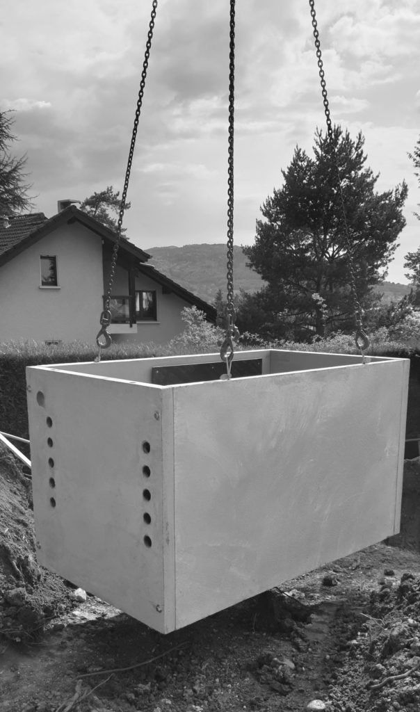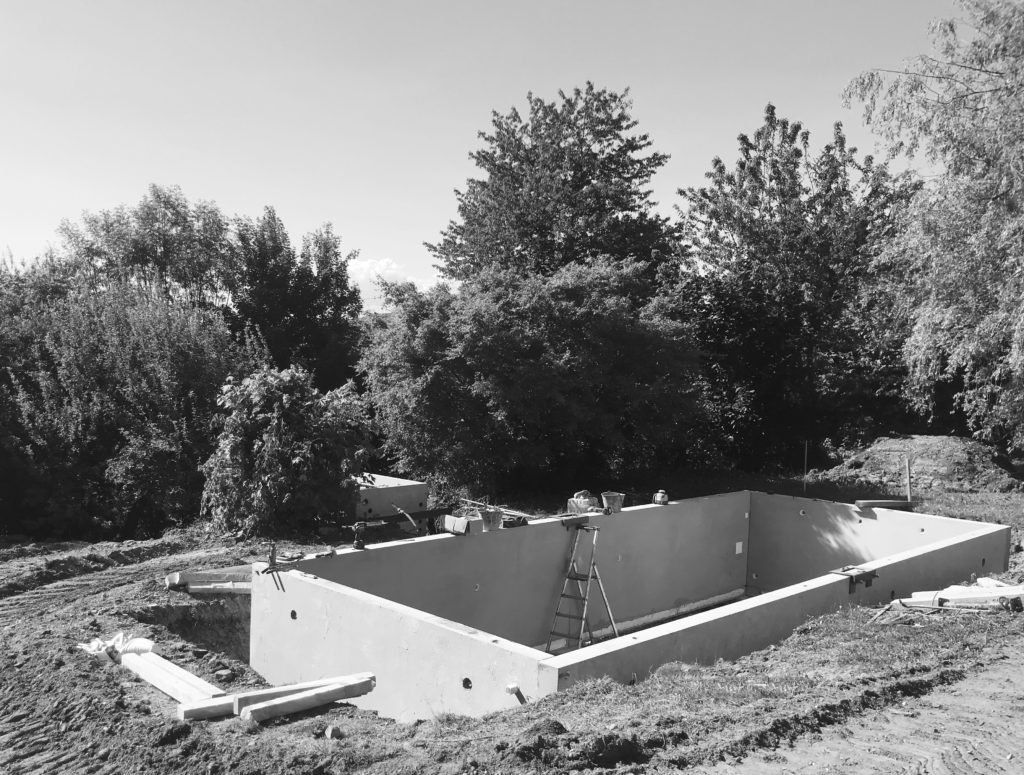 Un local technique en béton fabriqué à l'usine et prémonté. La pompe à chaleur intégrée au local et votre filtration biologique prémontée dans le local.