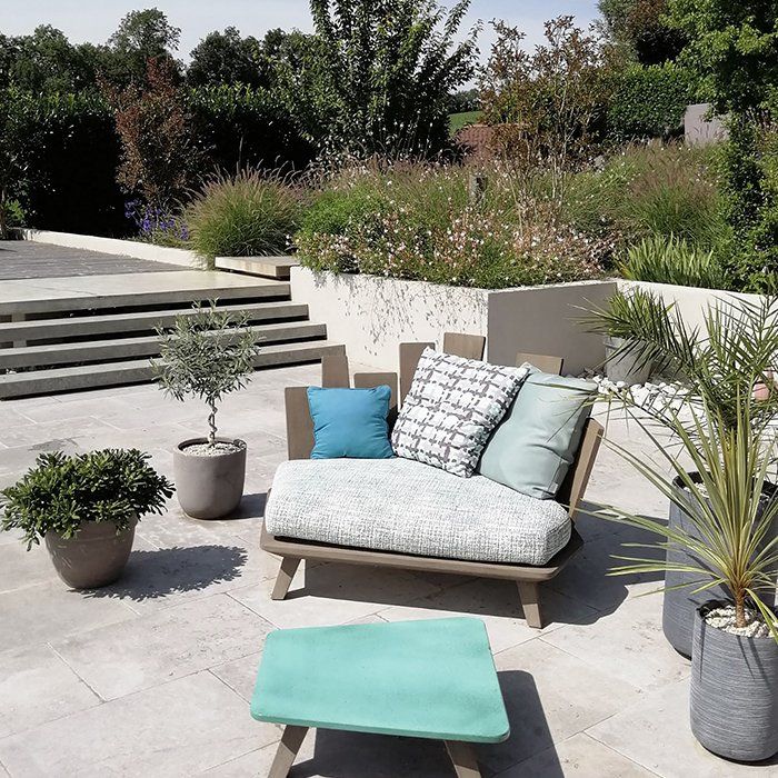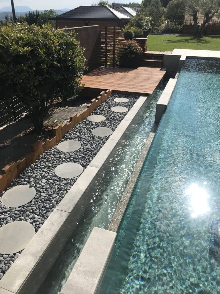 La terrasse, les escaliers, les margelles, la décoration de votre jardin autour de votre bassin de baignade fabriqué en même temps que votre bassin c'est possible.